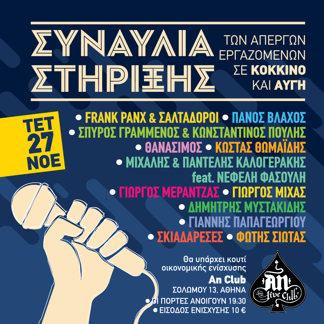 Όντας σε κινητοποιήσεις από τον περασμένο Ιούνιο, οπότε και ο ΣΥΡΙΖΑ έκλεισε το καθημερινό φύλλο της Αυγής, οι απεργοί εργαζόμενοι των ΜΜΕ του κόμματος κάλεσαν τους ακροατές και αναγνώστες του σε μια συναυλία που διοργάνωσαν, για την στήριξη και ενίσχυση του αγώνα τους ώστε να τους καταβληθούν τα δεδουλευμένα τους. Η συναυλία έγινε στο An Club στα Εξάρχεια (Σολωμού 13), την Τετάρτη 27 Νοεμβρίου, στις 19.30 και εισιτήριο στα 10 ευρώ, ενώ υπήρχε και κουτί οικονομικής ενίσχυσης του απεργιακού αγώνα των εργαζομένων.